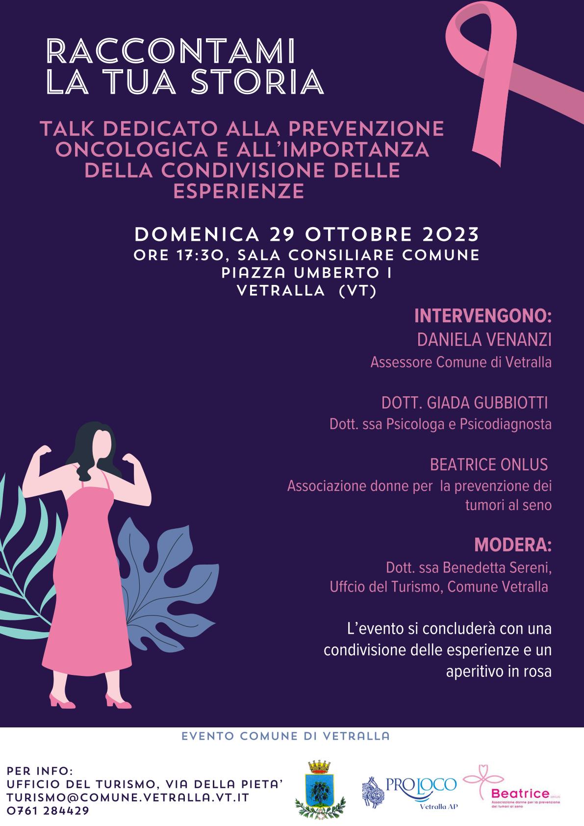 ott 13 2023 "Raccontami la tua storia" Talk dedicato alla prevenzione oncologica e all'importanza della condivisione delle esperienze da venerdì 13 ottobre 2023 - a domenica 29 ottobre 2023