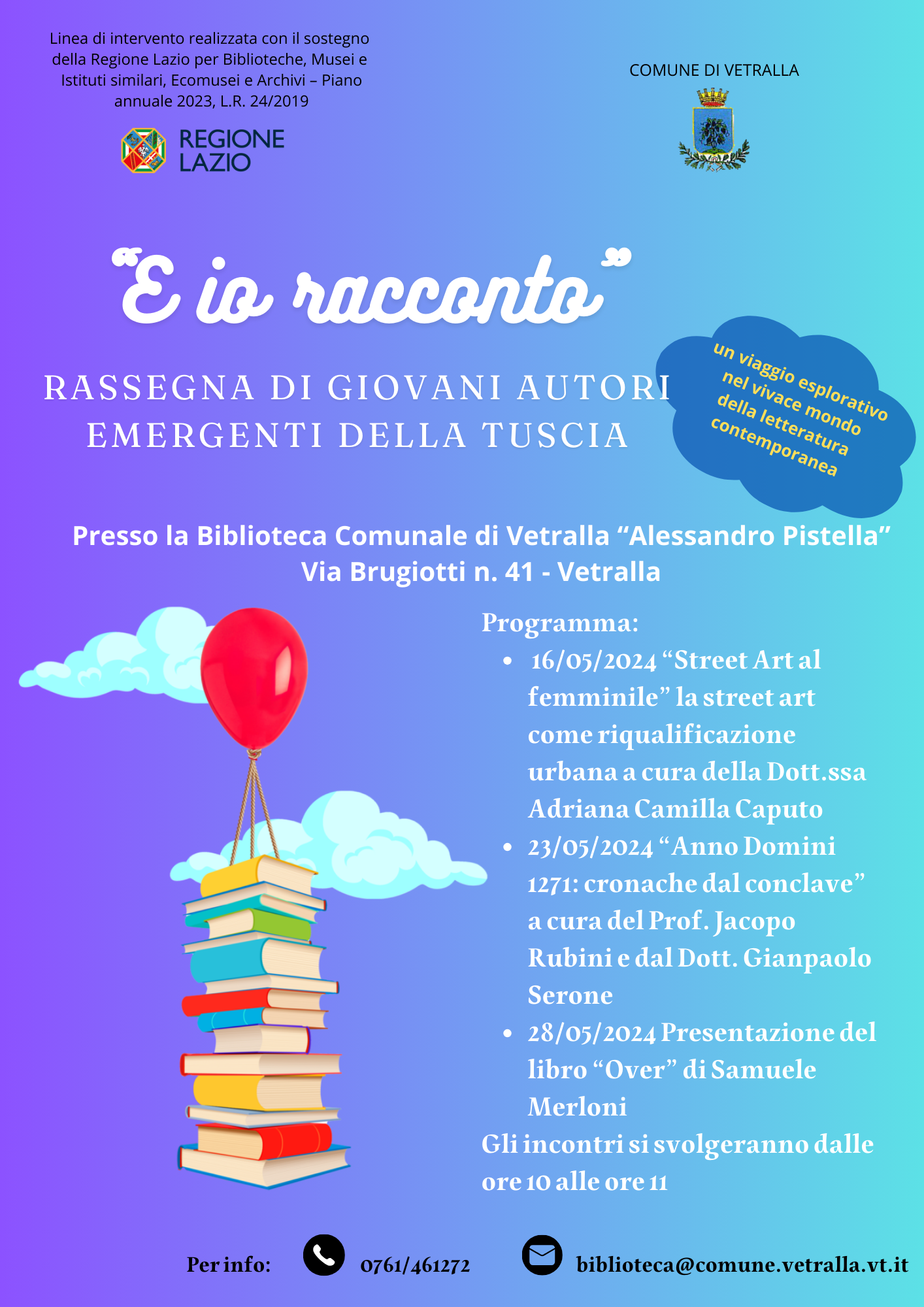 mag 05 2024 "E io racconto" - Rassegna letteraria di giovani autori della Tuscia nell'ambito degli interventi previsti L.R. 24/2019 - Piano 2023 da domenica 05 maggio 2024 - a mercoledì 29 maggio 2024